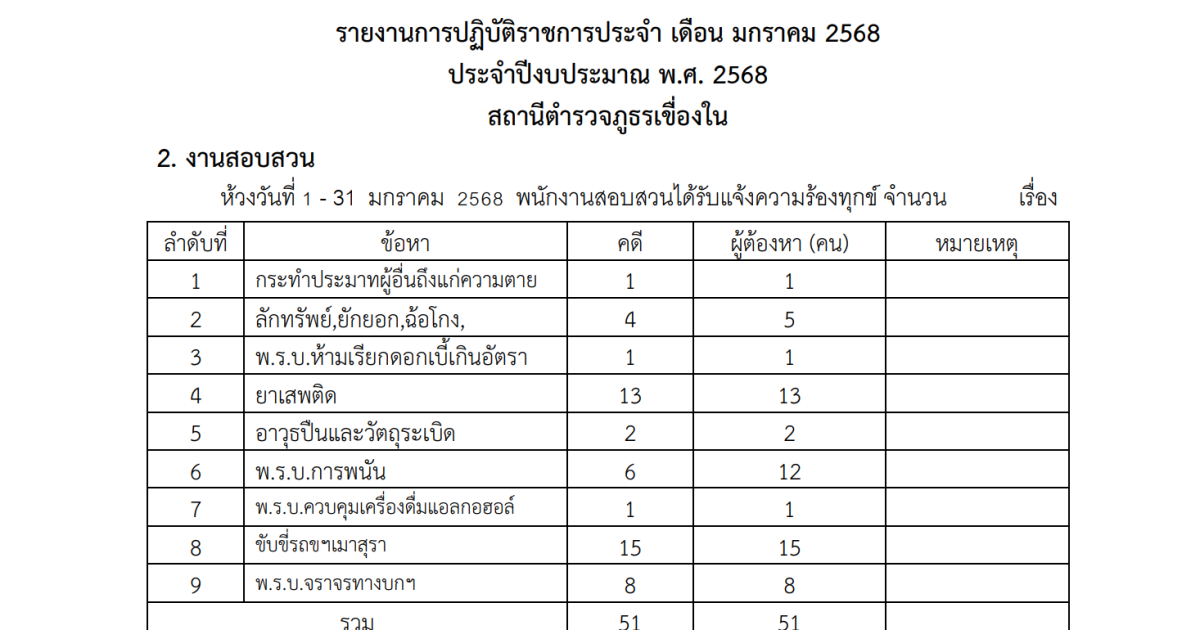 ผลการปฏิบัติงานสอบสวนประจำเดือน มกราคม 2568 31 มกราคม 2568 โดย admin / ผลงานของแต่ละสายงาน,งานสอบสวน รายงานการปฏิบัติราชการประจำ เดือน มกราคม 2568 Facebook iconFacebookTwitter iconTwitterLINE iconLine