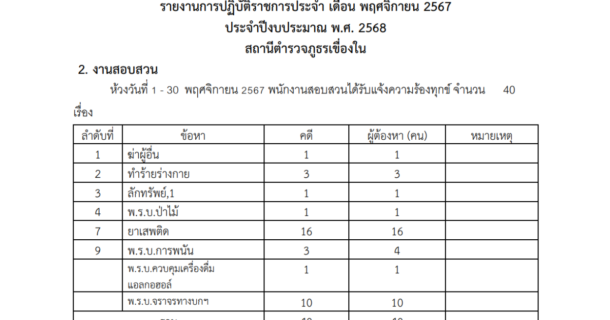 ผลการปฏิบัติงานสอบสวนประจำเดือน พศจิกายน 2567
